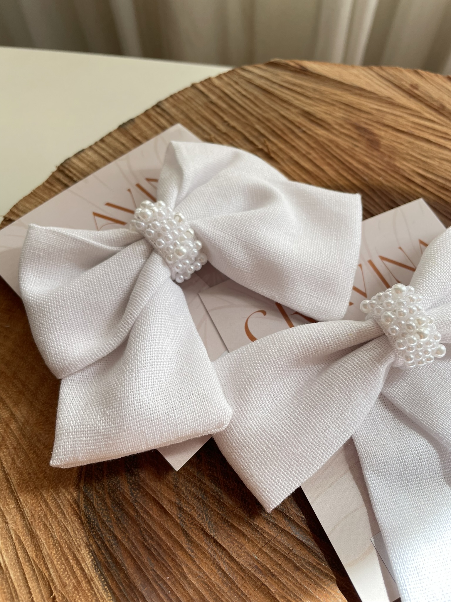 Tecido de linho, bordado com pérolas no meio.