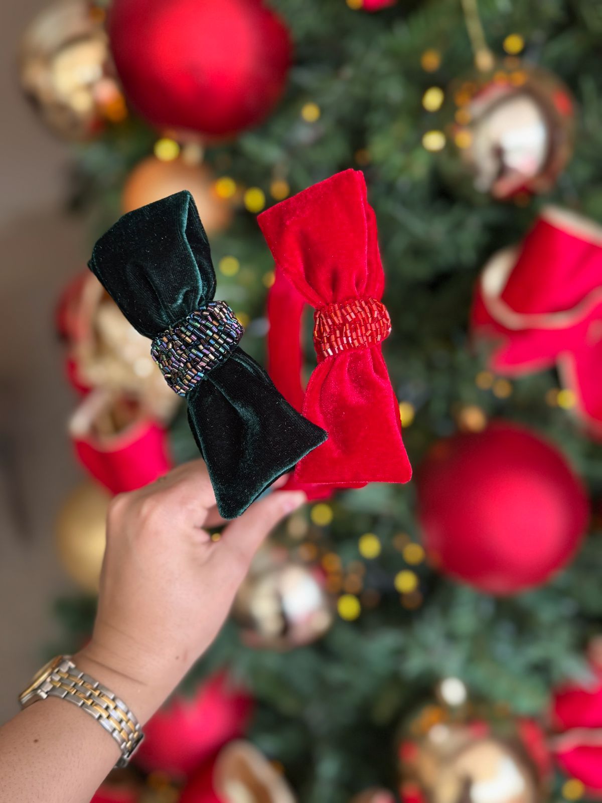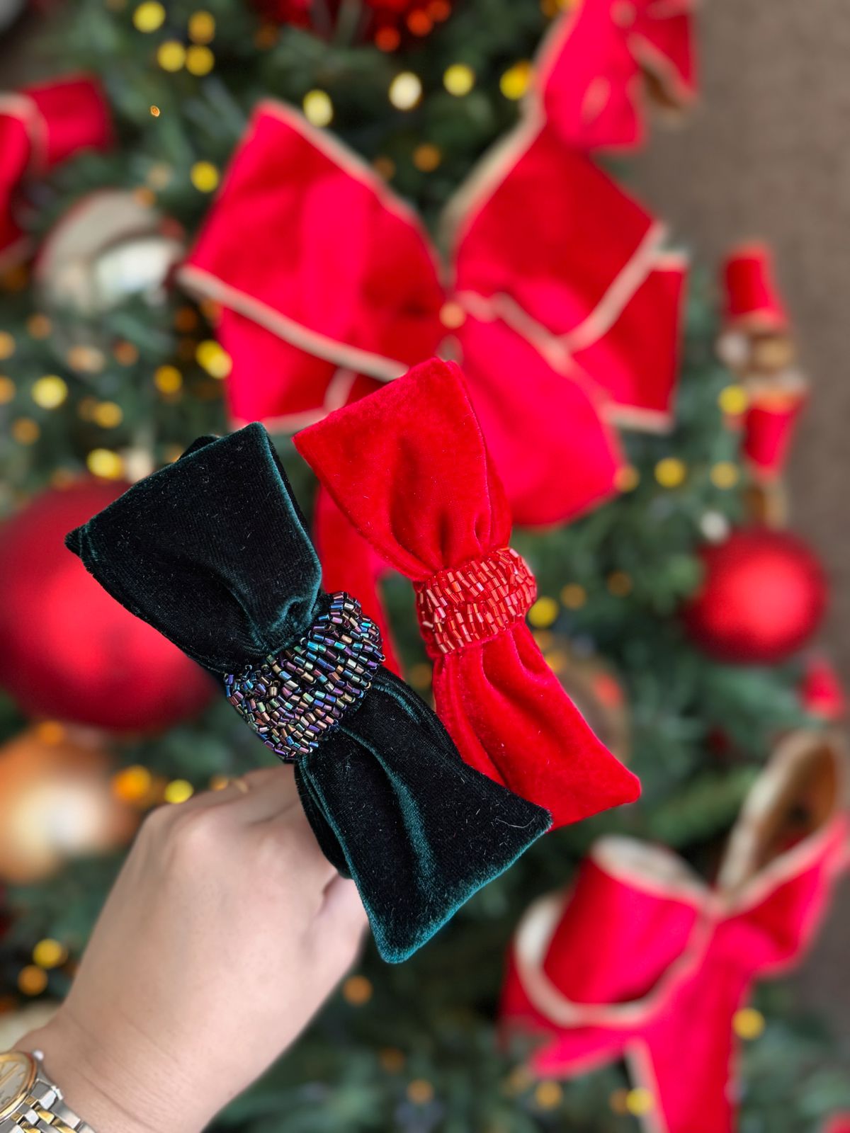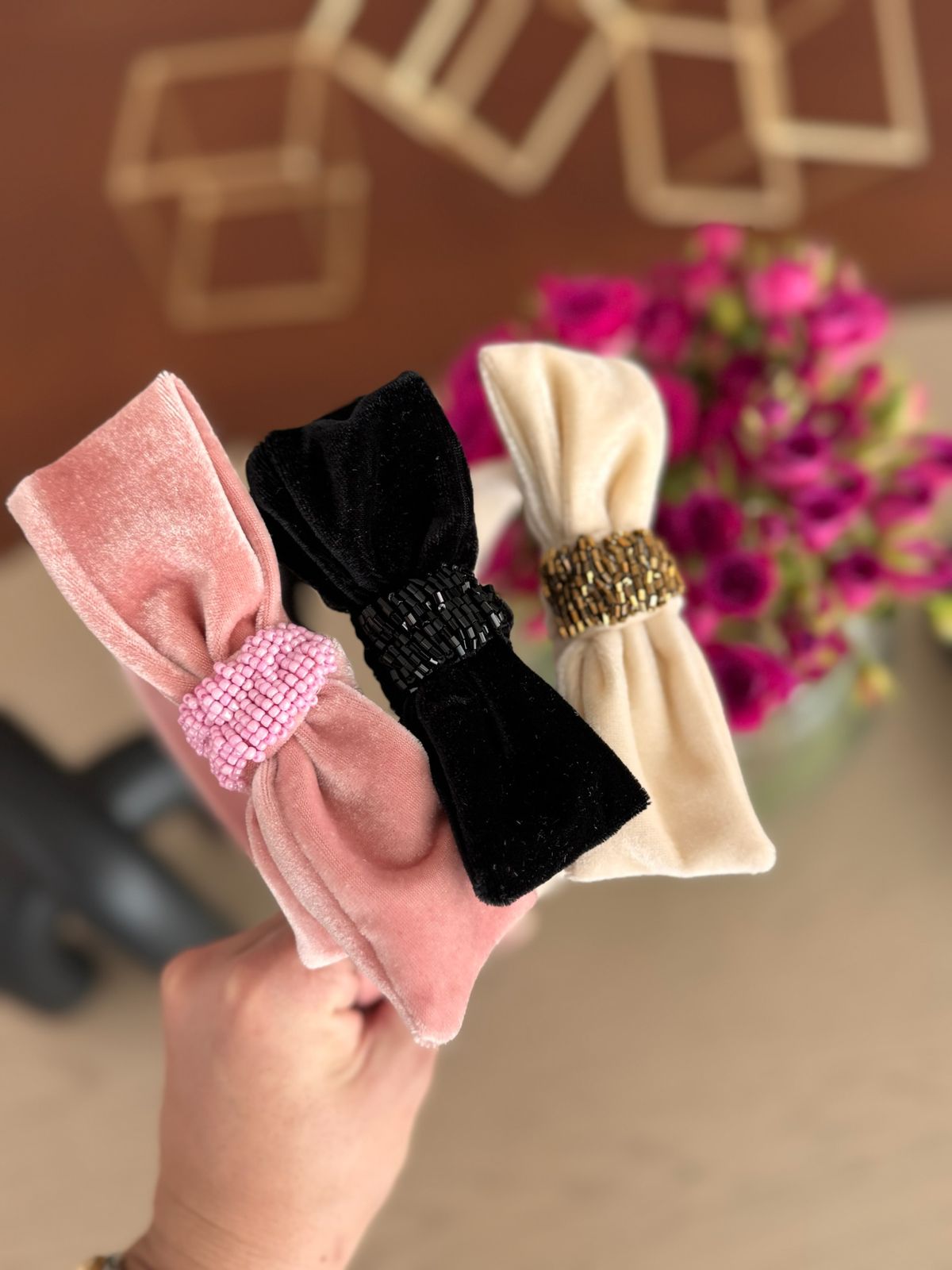 Laço no tecido de veludo. Tamanho G, com bordado de pedras no meio.